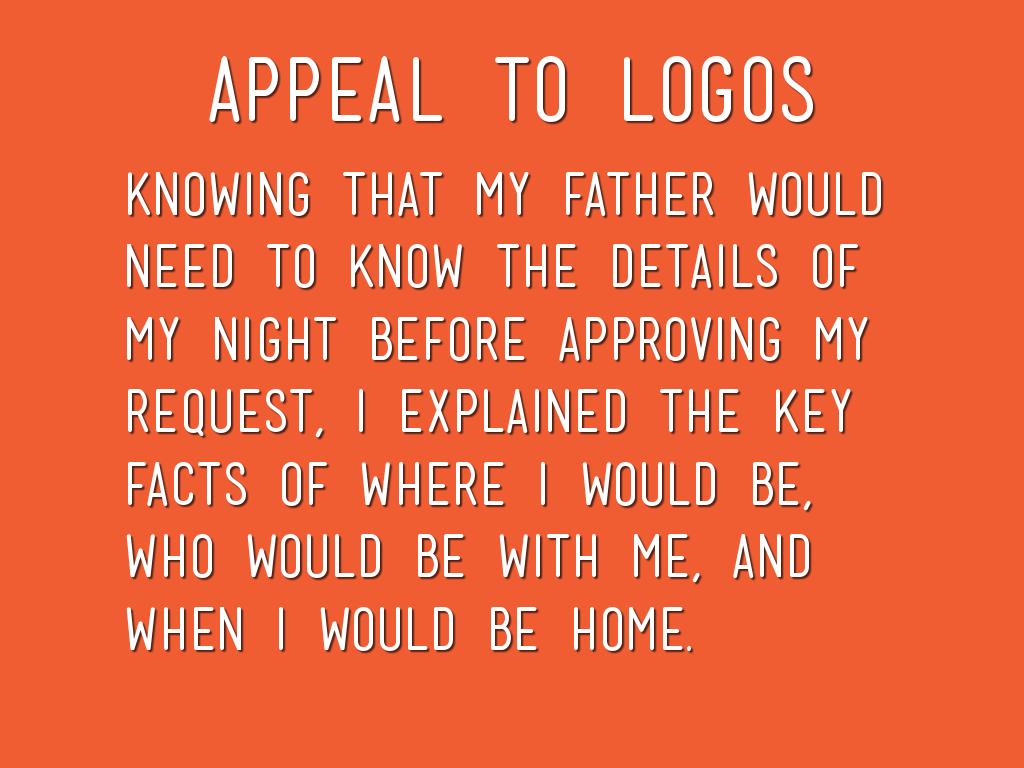 I reminded my father that I do not get into trouble and that everything turned out fine when he let me stay out before. This appealed to my father using my credibility and character as an individual.