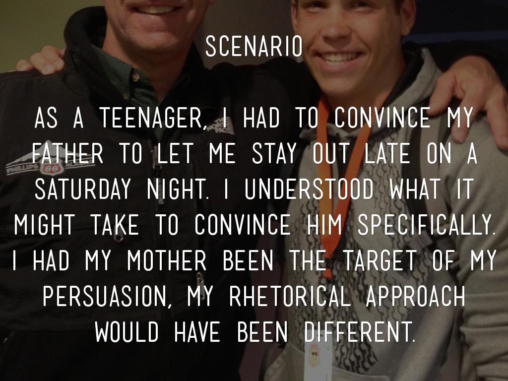 As a teenager, I had to convince my father to let me stay out late on a Saturday night. I understood what it might take to convince him specifically. I had my mother been the target of my persuasion, my rhetorical approach would have been different.