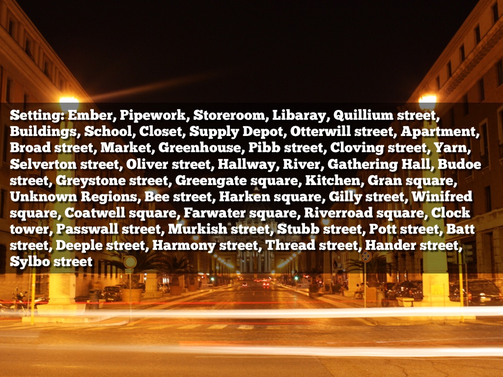 Setting: Ember, Pipework, Storeroom, Libaray, Quillium street, Buildings, School, Closet, Supply Depot, Otterwill street, Apartment, Broad street, Market, Greenhouse, Pibb street, Cloving street, Yarn, Selverton street, Oliver street, Hallway, River, Gathering Hall, Budoe street, Greystone street, Greengate square, Kitchen, Gran square, Unknown Regions, Bee street, Harken square, Gilly street, Winifred square, Coatwell square, Farwater square, Riverroad square, Clock tower, Passwall street, Murkish street, Stubb street, Pott street, Batt street, Deeple street, Harmony street, Thread street, Hander street, Sylbo street