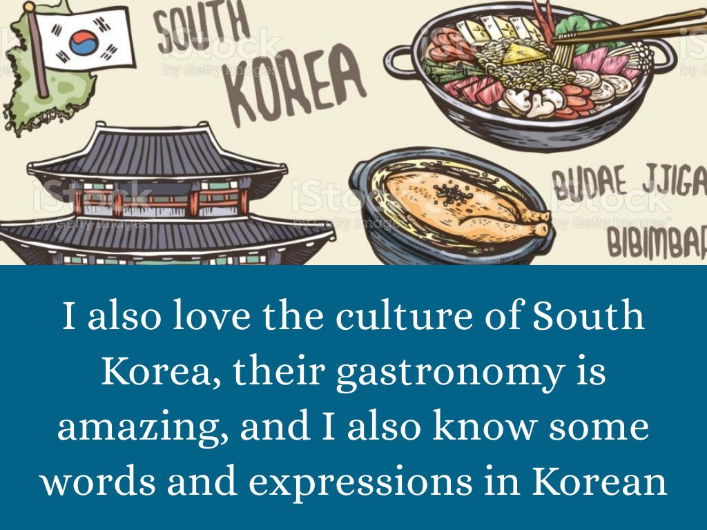 I also love the culture of South Korea, their gastronomy is amazing, and I also know some words and expressions in Korean