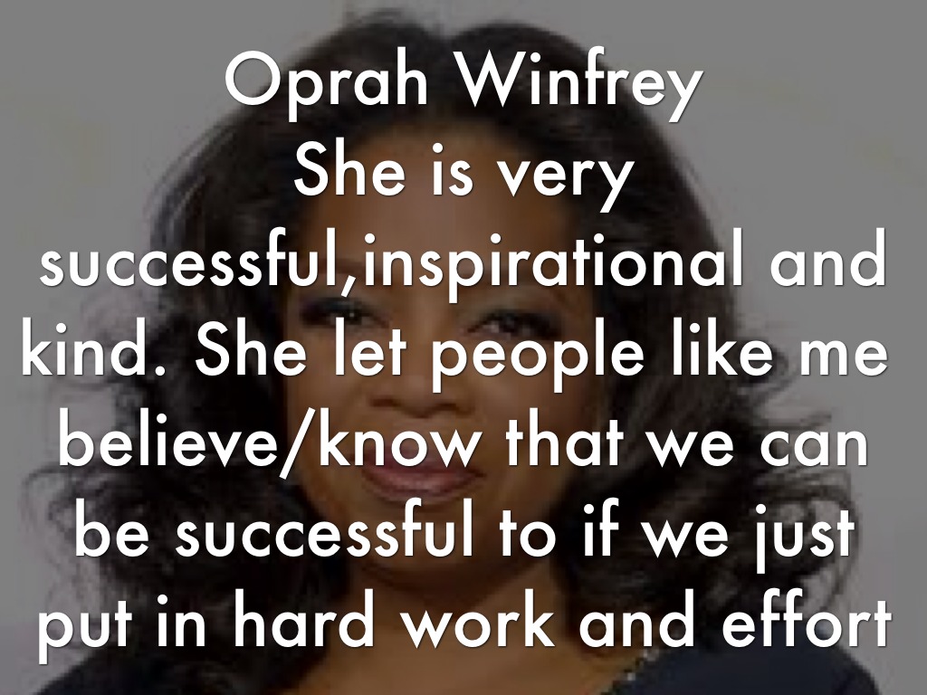 Oprah Winfrey She is very successful,inspirational and kind. She let people like me believe/know that we can be successful to if we just put in hard work and effort