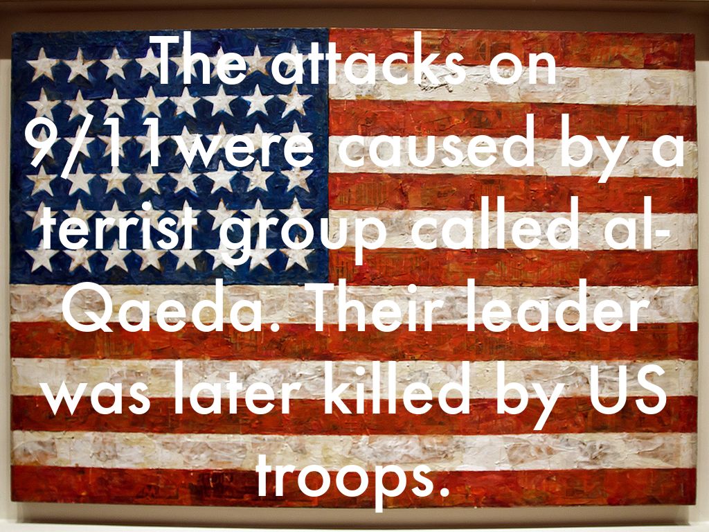 The attacks on 9/11were caused by a terrist group called al-Qaeda. Their leader was later killed by US troops.