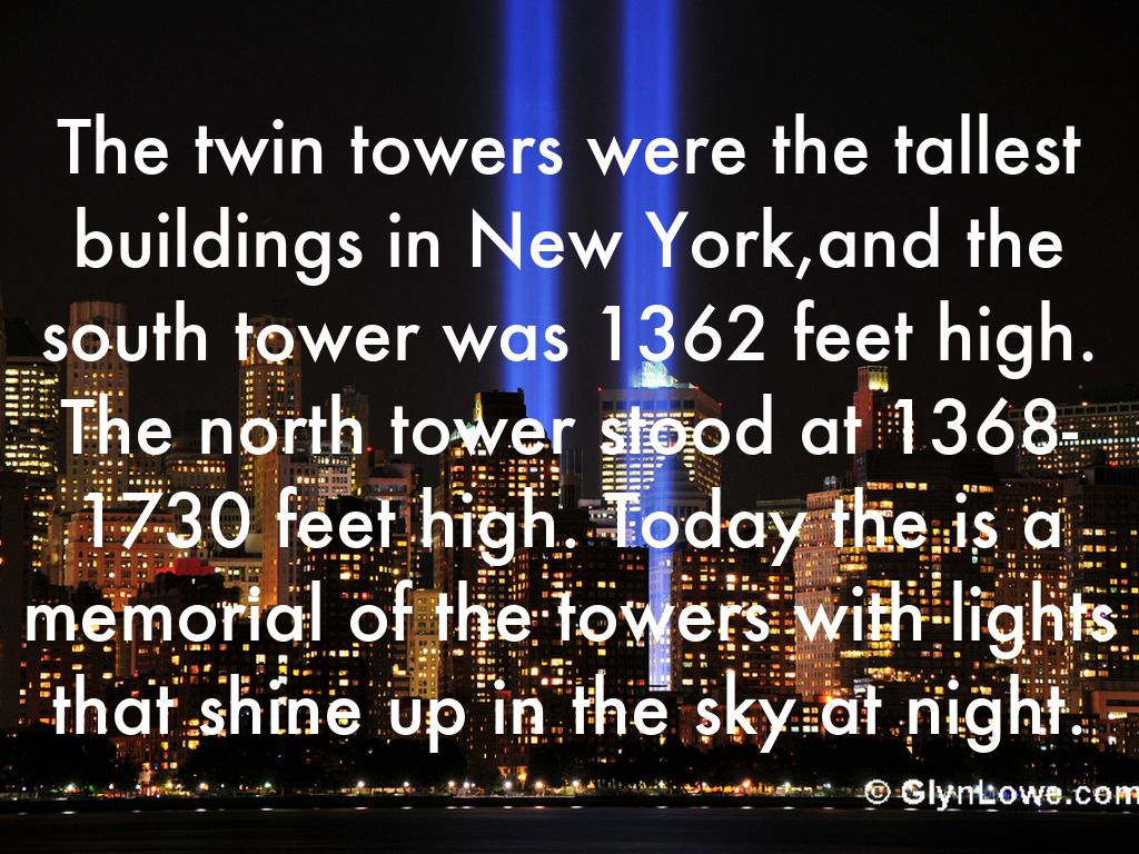 The twin towers were the tallest buildings in New York,and the south tower was 1362 feet high. The north tower stood at 1368-1730 feet high. Today the is a memorial of the towers with lights that shine up in the sky at night.