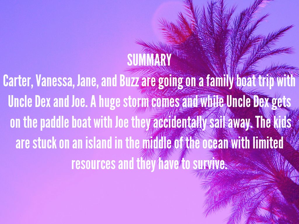 Carter, Vanessa, Jane, and Buzz are going on a family boat trip with Uncle Dex and Joe. A huge storm comes and while Uncle Dex gets on the paddle boat with Joe they accidentally sail away. The kids are stuck on an island in the middle of the ocean with limited resources and they have to survive.