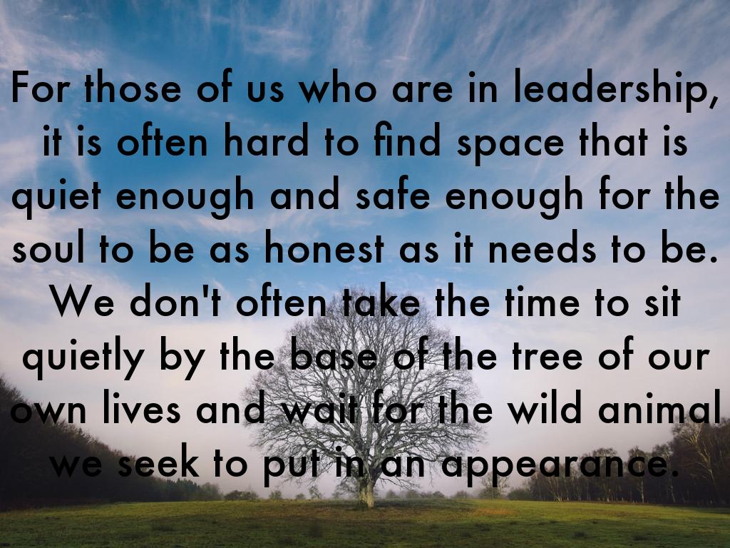For those of us who are in leadership, it is often hard to find space that is quiet enough and safe enough for the soul to be as honest as it needs to be. We don't often take the time to sit quietly by the base of the tree of our own lives and wait for the wild animal we seek to put in an appearance.
