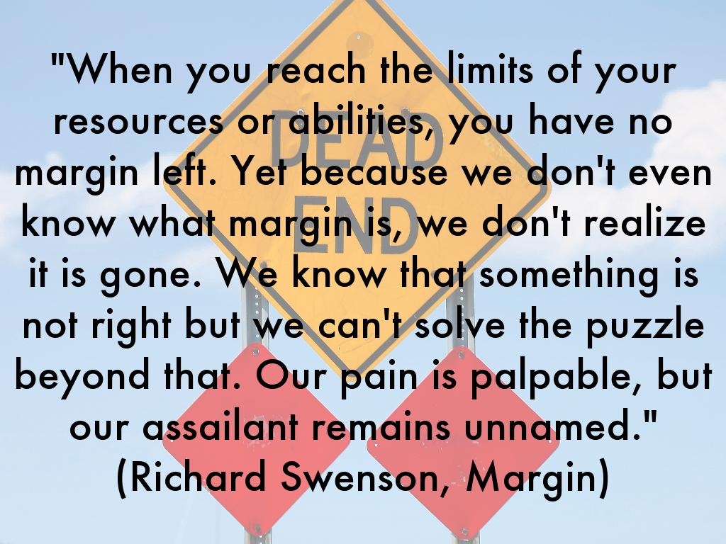 "When you reach the limits of your resources or abilities, you have no margin left. Yet because we don't even know what margin is, we don't realize it is gone. We know that something is not right but we can't solve the puzzle beyond that. Our pain is palpable, but our assailant remains unnamed." (Richard Swenson, Margin)