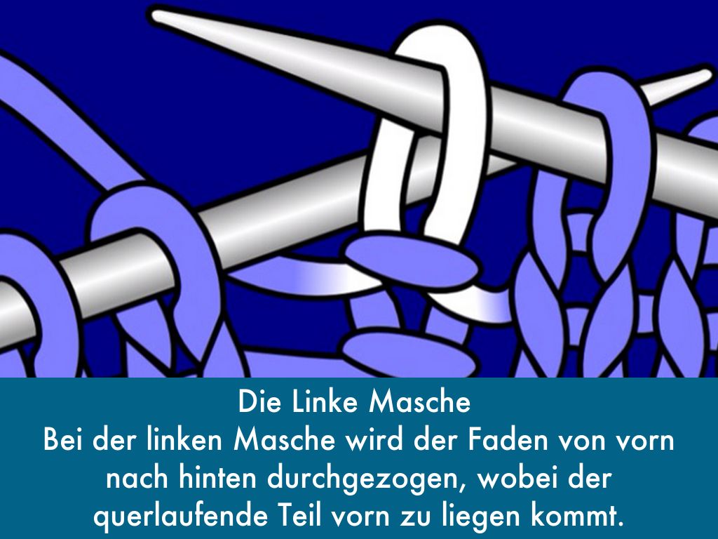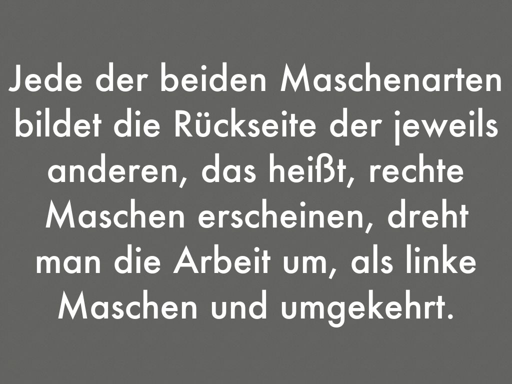 Jede der beiden Maschenarten bildet die Rückseite der jeweils anderen, das heißt, rechte Maschen erscheinen, dreht man die Arbeit um, als linke Maschen und umgekehrt.