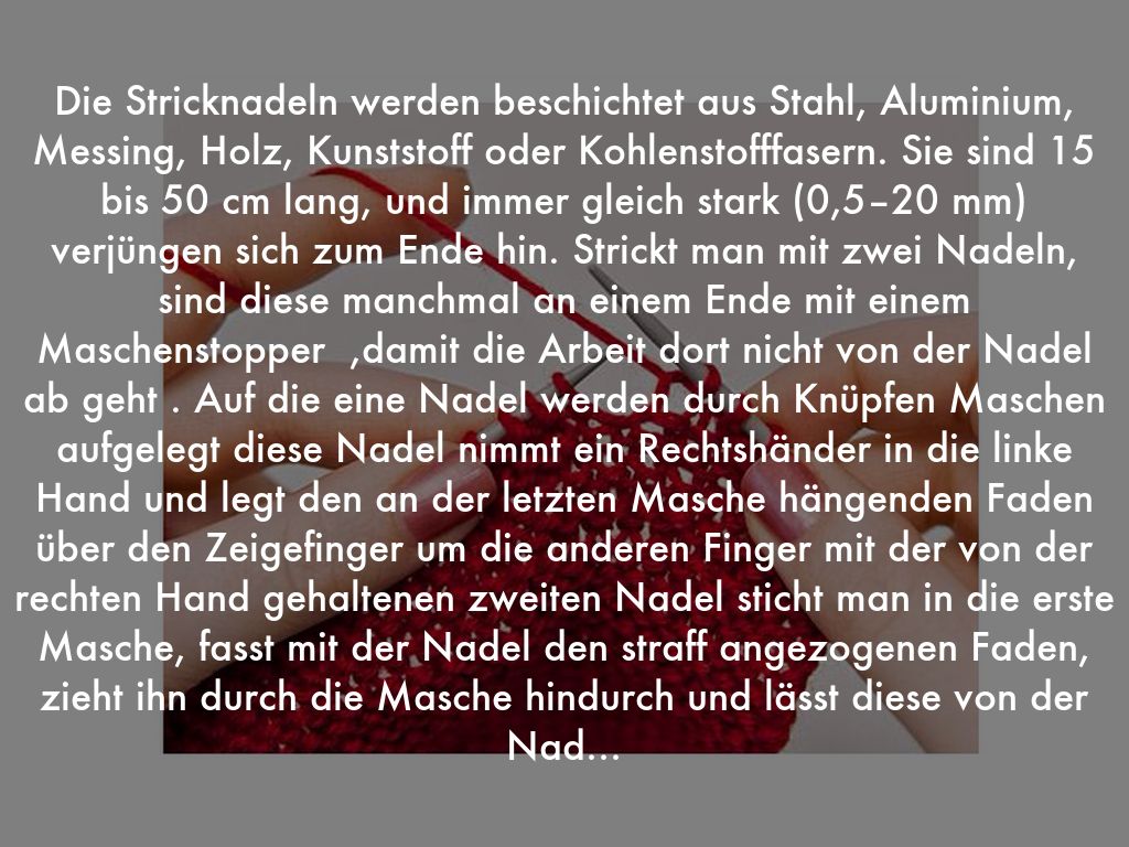 Die Stricknadeln werden beschichtet aus Stahl, Aluminium, Messing, Holz, Kunststoff oder Kohlenstofffasern. Sie sind 15 bis 50 cm lang, und immer gleich stark (0,5–20 mm) verjüngen sich zum Ende hin. Strickt man mit zwei Nadeln, sind diese manchmal an einem Ende mit einem Maschenstopper ,damit die Arbeit dort nicht von der Nadel ab geht . Auf die eine Nadel werden durch Knüpfen Maschen aufgelegt diese Nadel nimmt ein Rechtshänder in die linke Hand und legt den an der letzten Masche hängenden Faden über den Zeigefinger um die anderen Finger mit der von der rechten Hand gehaltenen zweiten Nadel sticht man in die erste Masche, fasst mit der Nadel den straff angezogenen Faden, zieht ihn durch die Masche hindurch und lässt diese von der Nad…
