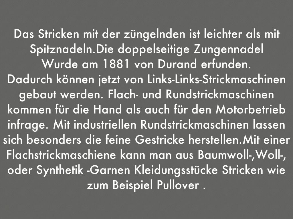 Dadurch können jetzt von Links-Links-Strickmaschinen gebaut werden. Flach- und Rundstrickmaschinen kommen für die Hand als auch für den Motorbetrieb infrage. Mit industriellen Rundstrickmaschinen lassen sich besonders die feine Gestricke herstellen.Mit einer Flachstrickmaschiene kann man aus Baumwoll-,Woll-, oder Synthetik -Garnen Kleidungsstücke Stricken wie zum Beispiel Pullover .