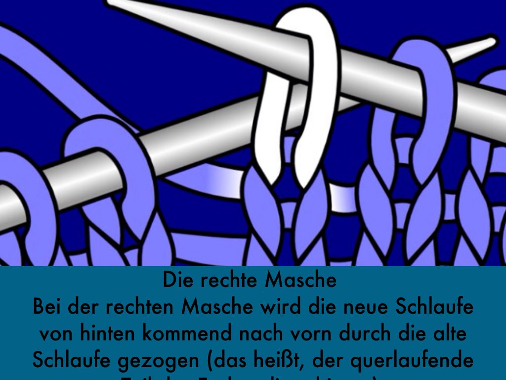 Bei der rechten Masche wird die neue Schlaufe von hinten kommend nach vorn durch die alte Schlaufe gezogen (das heißt, der querlaufende Teil des Fadens liegt hinten).