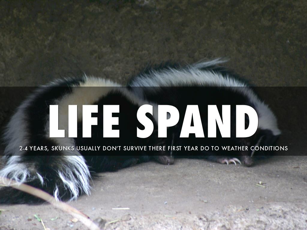 2-4 YEARS, SKUNKS USUALLY DON’T SURVIVE THERE FIRST YEAR DO TO WEATHER CONDITIONS