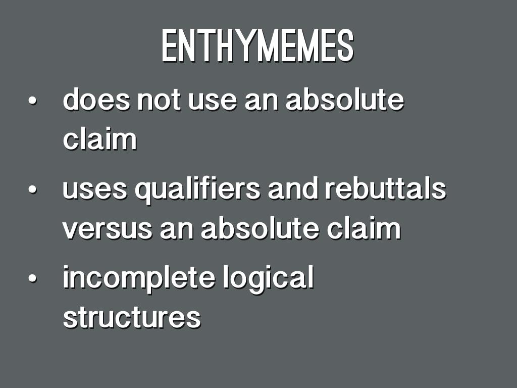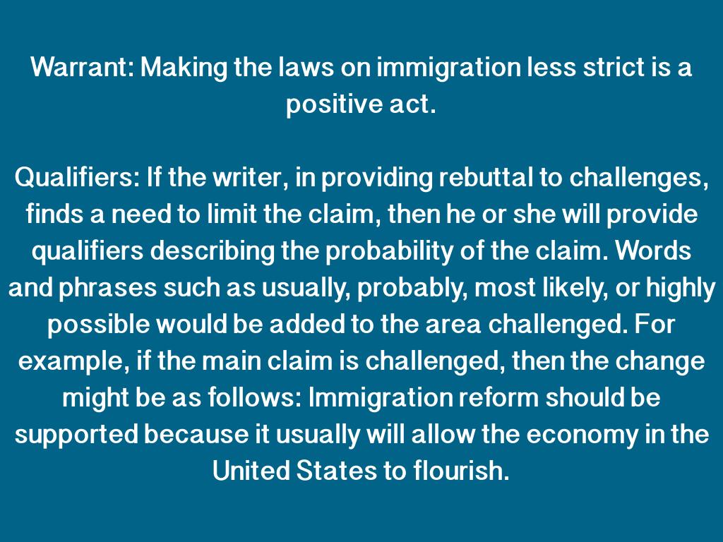 Qualifiers: If the writer, in providing rebuttal to challenges, finds a need to limit the claim, then he or she will provide qualifiers describing the probability of the claim. Words and phrases such as usually, probably, most likely, or highly possible would be added to the area challenged. For example, if the main claim is challenged, then the change might be as follows: Immigration reform should be supported because it usually will allow the economy in the United States to flourish.
