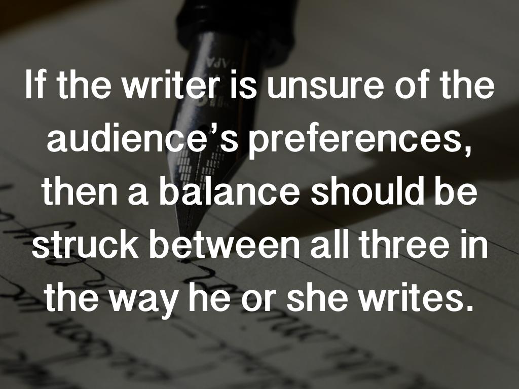 If the writer is unsure of the audience’s preferences, then a balance should be struck between all three in the way he or she writes.