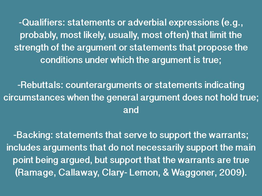 -Backing: statements that serve to support the warrants; includes arguments that do not necessarily support the main point being argued, but support that the warrants are true (Ramage, Callaway, Clary- Lemon, & Waggoner, 2009).
