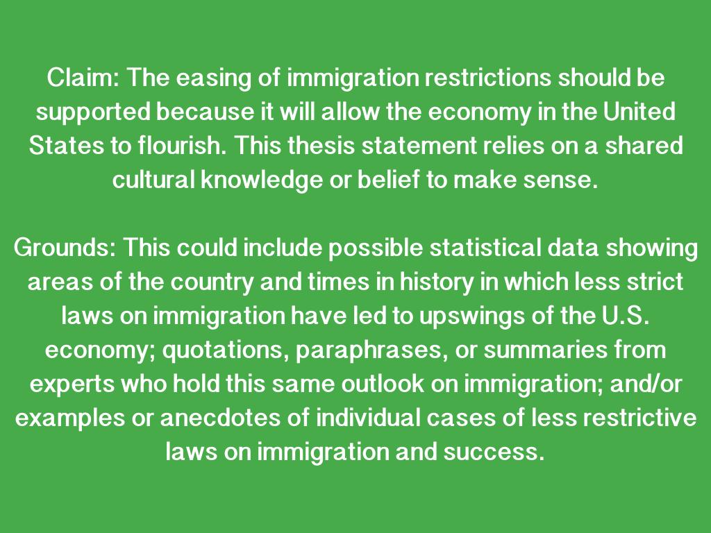 Claim: The easing of immigration restrictions should be supported because it will allow the economy in the United States to flourish. This thesis statement relies on a shared cultural knowledge or belief to make sense.