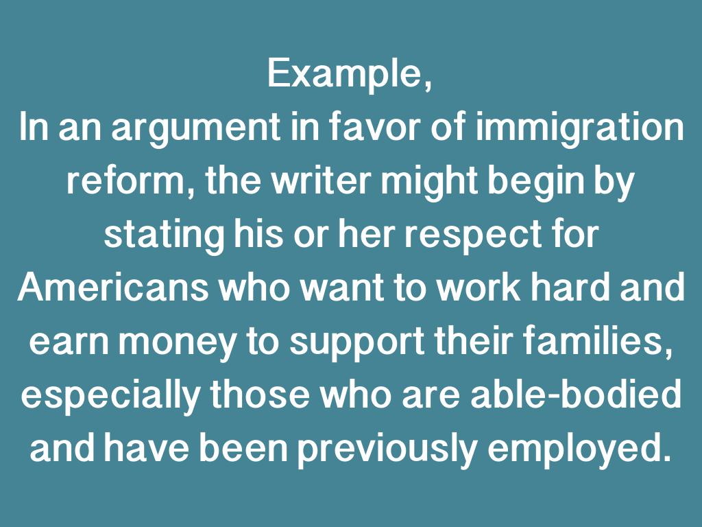 In an argument in favor of immigration reform, the writer might begin by stating his or her respect for Americans who want to work hard and earn money to support their families, especially those who are able-bodied and have been previously employed.