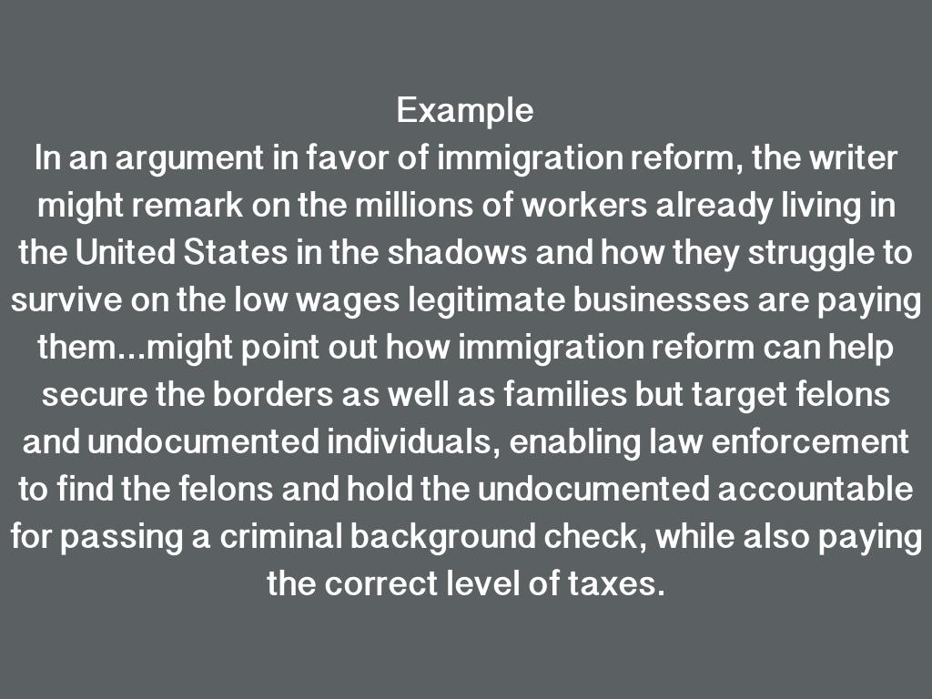 In an argument in favor of immigration reform, the writer might remark on the millions of workers already living in the United States in the shadows and how they struggle to survive on the low wages legitimate businesses are paying them...might point out how immigration reform can help secure the borders as well as families but target felons and undocumented individuals, enabling law enforcement to find the felons and hold the undocumented accountable for passing a criminal background check, while also paying the correct level of taxes.