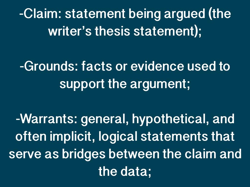 -Warrants: general, hypothetical, and often implicit, logical statements that serve as bridges between the claim and the data;