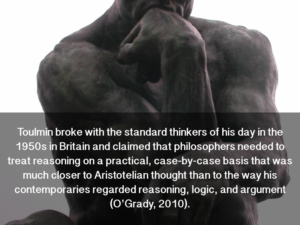 Toulmin broke with the standard thinkers of his day in the 1950s in Britain and claimed that philosophers needed to treat reasoning on a practical, case-by-case basis that was much closer to Aristotelian thought than to the way his contemporaries regarded reasoning, logic, and argument (O’Grady, 2010).