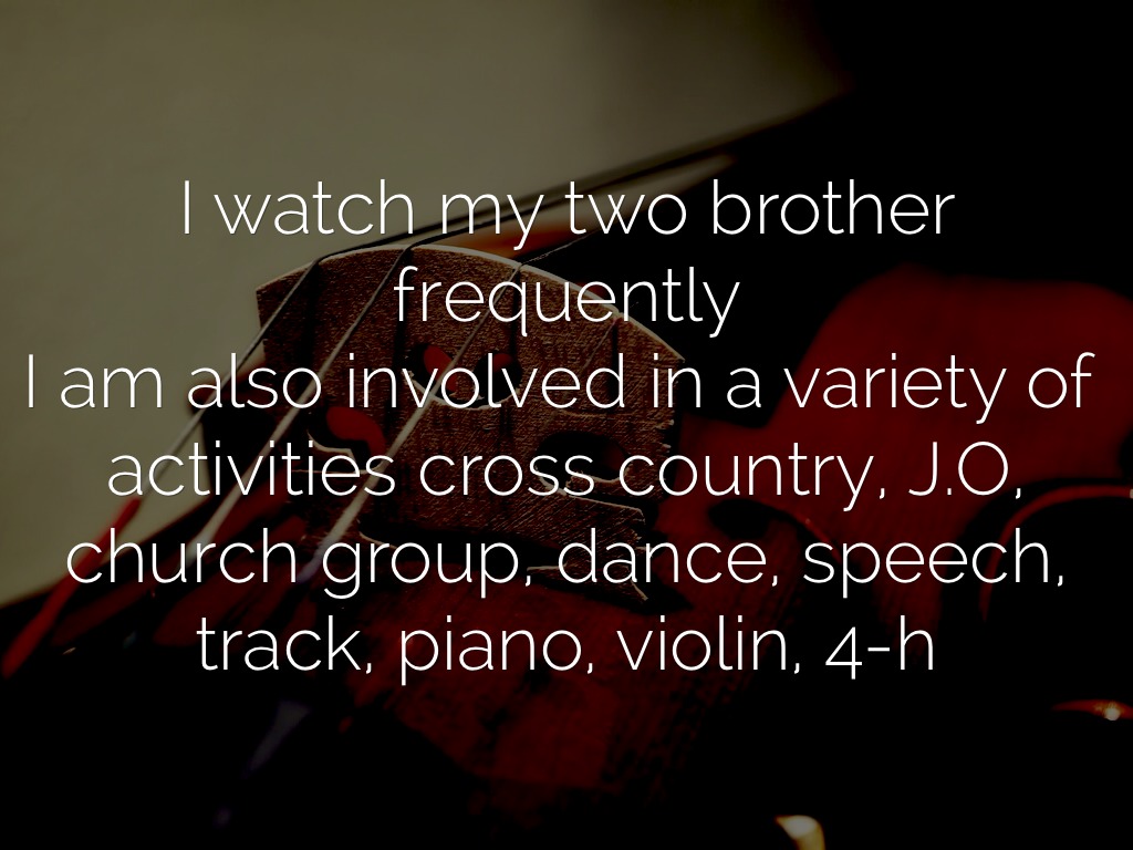 I am also involved in a variety of activities cross country, J.O, church group, dance, speech, track, piano, violin, 4-h