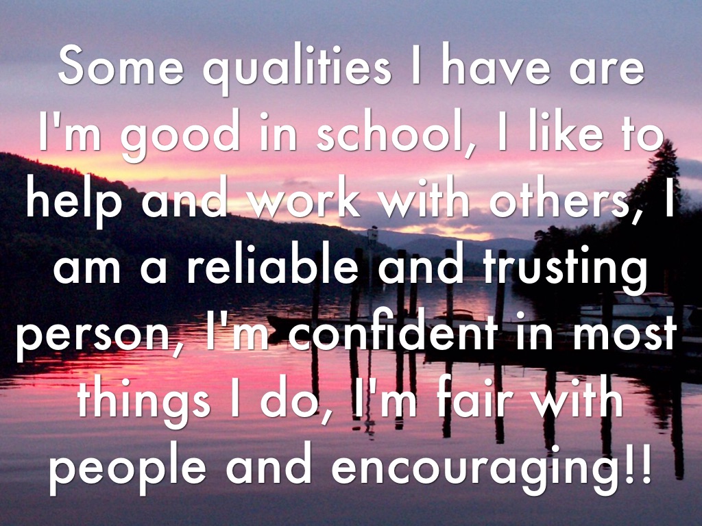 I'm good in school, I like to help and work with others, I am a reliable and trusting person, I'm confident in most things I do, I'm fair with people and encouraging!!