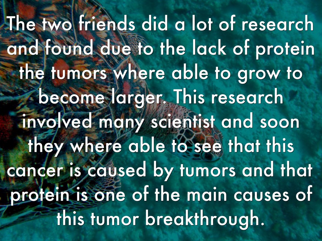 The two friends did a lot of research and found due to the lack of protein the tumors where able to grow to become larger. This research involved many scientist and soon they where able to see that this cancer is caused by tumors and that protein is one of the main causes of this tumor breakthrough.