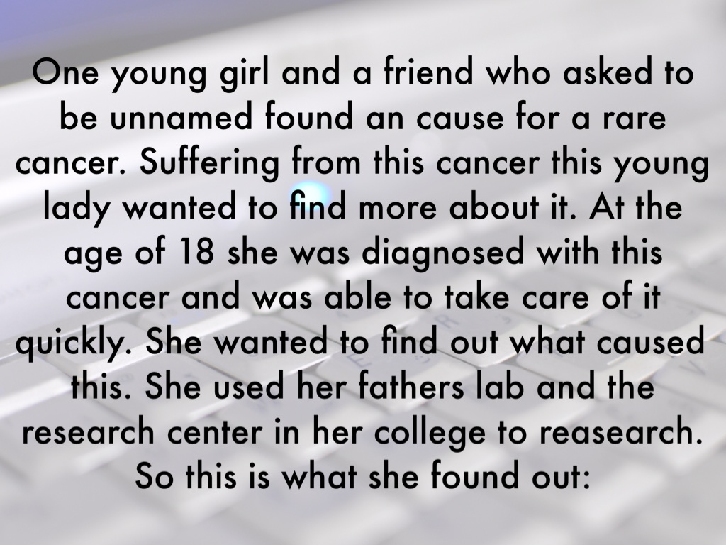 One young girl and a friend who asked to be unnamed found an cause for a rare cancer. Suffering from this cancer this young lady wanted to find more about it. At the age of 18 she was diagnosed with this cancer and was able to take care of it quickly. She wanted to find out what caused this. She used her fathers lab and the research center in her college to reasearch. So this is what she found out: