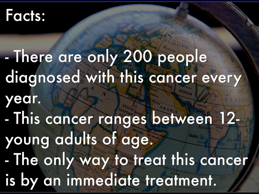 - There are only 200 people diagnosed with this cancer every year. - This cancer ranges between 12- young adults of age. - The only way to treat this cancer is by an immediate treatment.