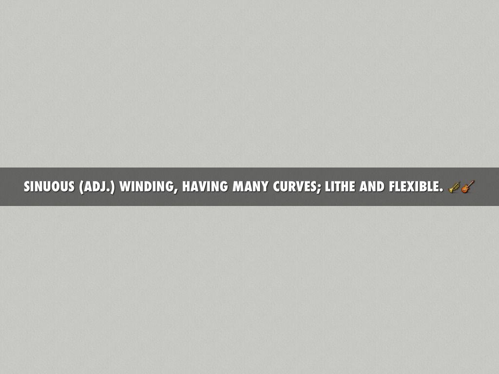 sinuous (adj.) winding, having many curves; lithe and flexible.