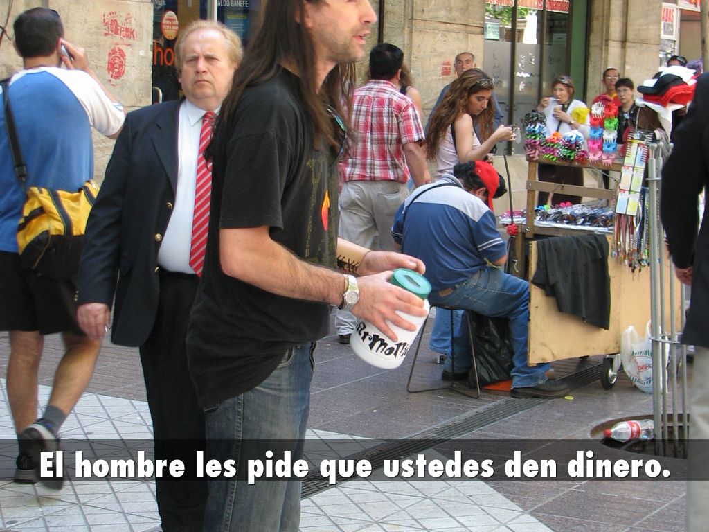 El hombre les pide que ustedes den dinero.