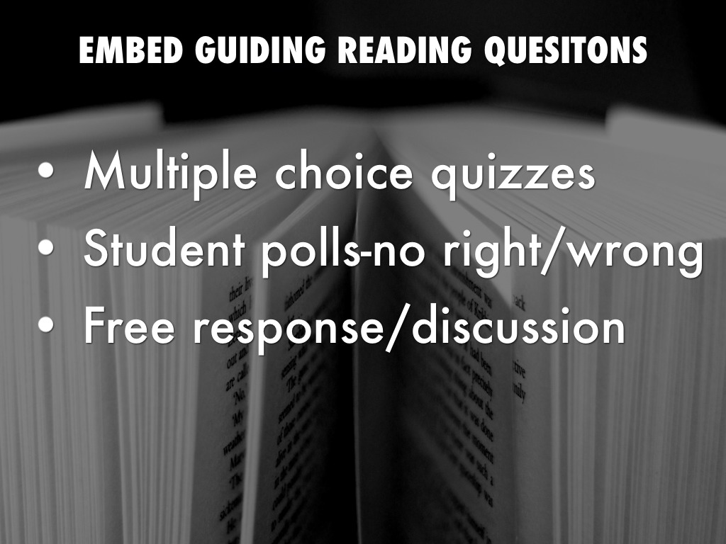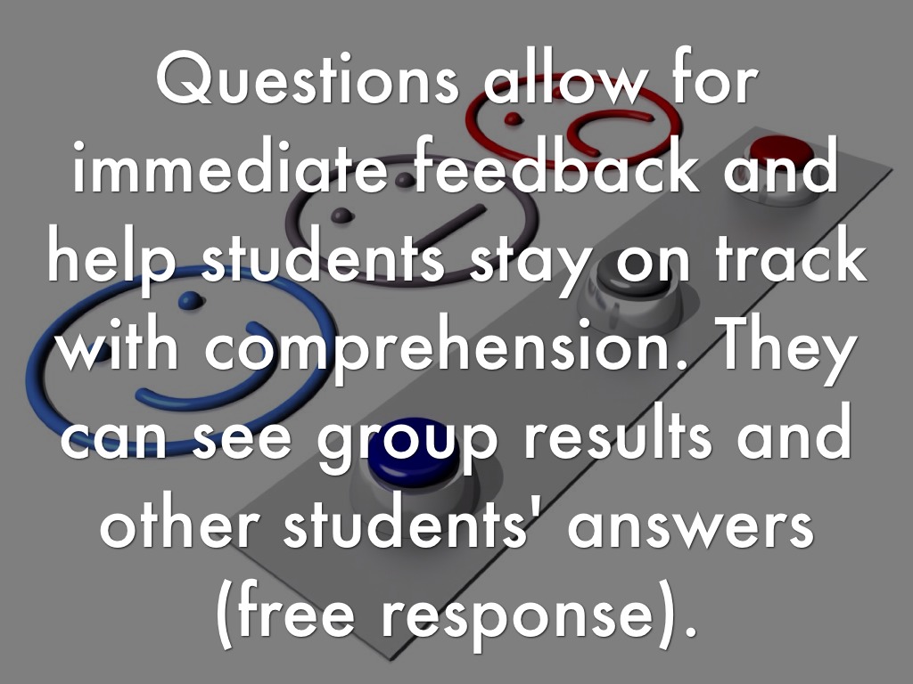 Questions allow for immediate feedback and help students stay on track with comprehension. They can see group results and other students' answers (free response).