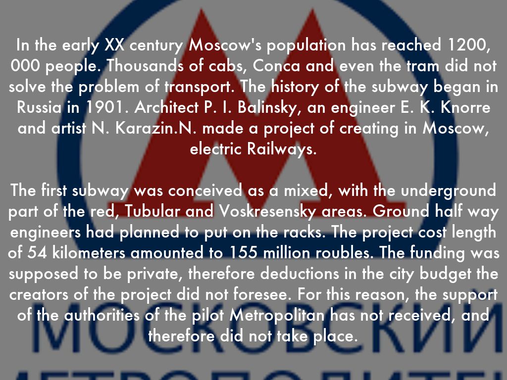 In the early XX century Moscow's population has reached 1200, 000 people. Thousands of cabs, Conca and even the tram did not solve the problem of transport. The history of the subway began in Russia in 1901. Architect P. I. Balinsky, an engineer E. K. Knorre and artist N. Karazin.N. made a project of creating in Moscow, electric Railways.