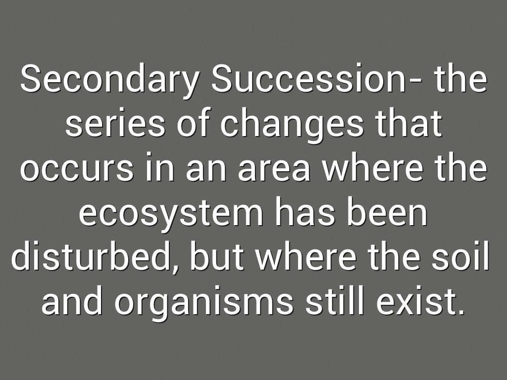 Secondary Succession- the series of changes that occurs in an area where the ecosystem has been disturbed, but where the soil and organisms still exist.