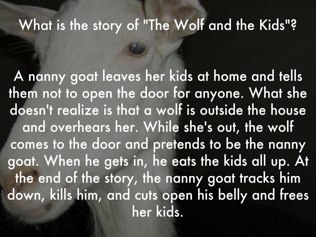 A nanny goat leaves her kids at home and tells them not to open the door for anyone. What she doesn't realize is that a wolf is outside the house and overhears her. While she's out, the wolf comes to the door and pretends to be the nanny goat. When he gets in, he eats the kids all up. At the end of the story, the nanny goat tracks him down, kills him, and cuts open his belly and frees her kids.