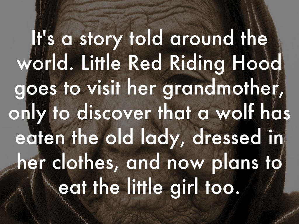 It's a story told around the world. Little Red Riding Hood goes to visit her grandmother, only to discover that a wolf has eaten the old lady, dressed in her clothes, and now plans to eat the little girl too.