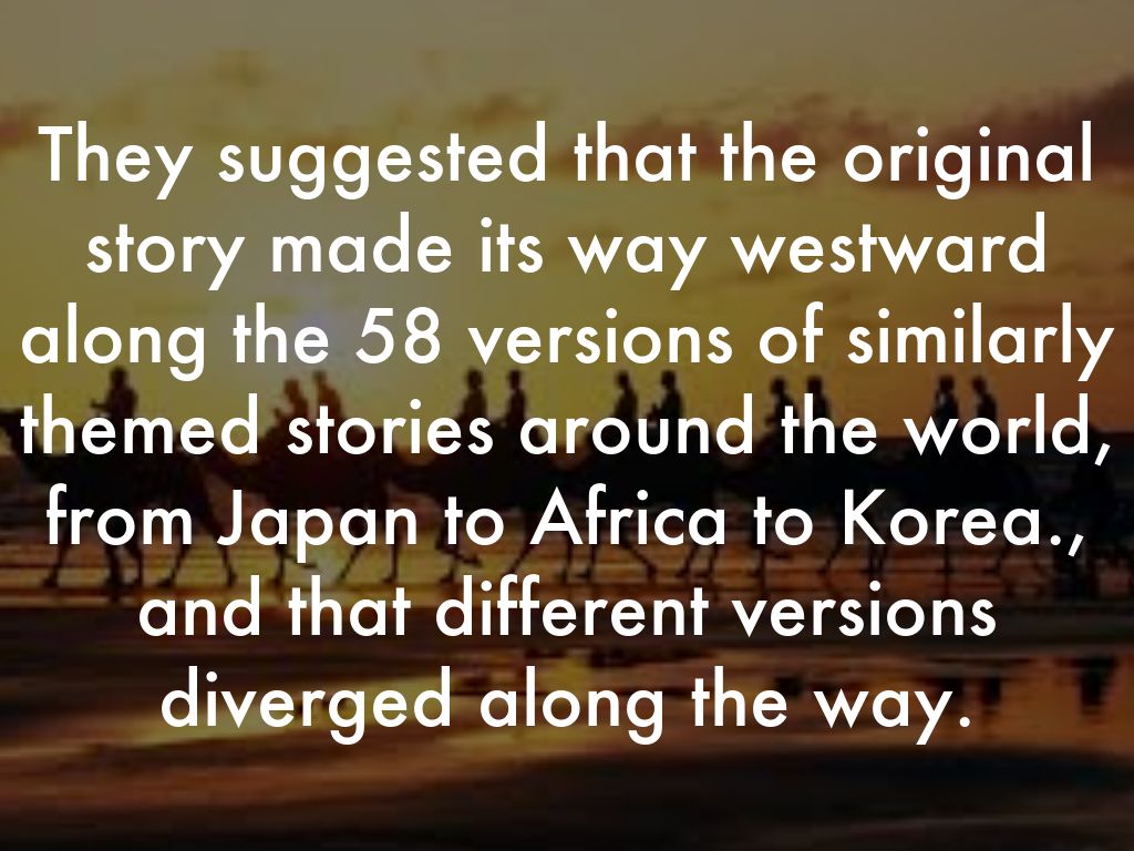 They suggested that the original story made its way westward along the 58 versions of similarly themed stories around the world, from Japan to Africa to Korea., and that different versions diverged along the way.