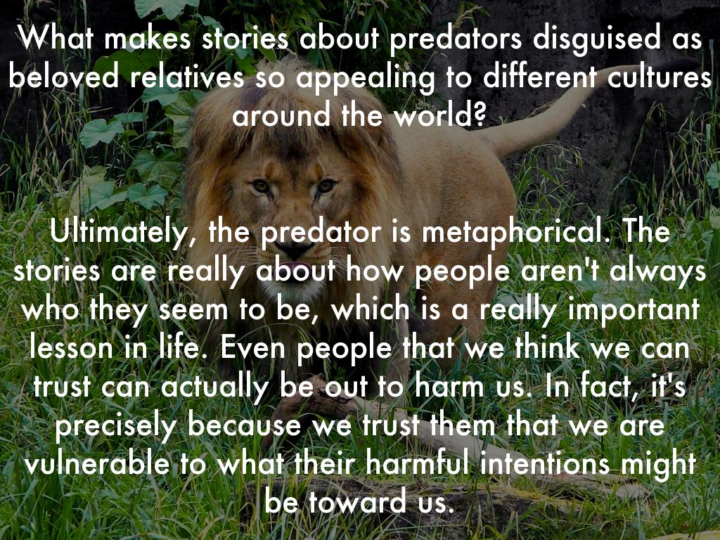 Ultimately, the predator is metaphorical. The stories are really about how people aren't always who they seem to be, which is a really important lesson in life. Even people that we think we can trust can actually be out to harm us. In fact, it's precisely because we trust them that we are vulnerable to what their harmful intentions might be toward us.
