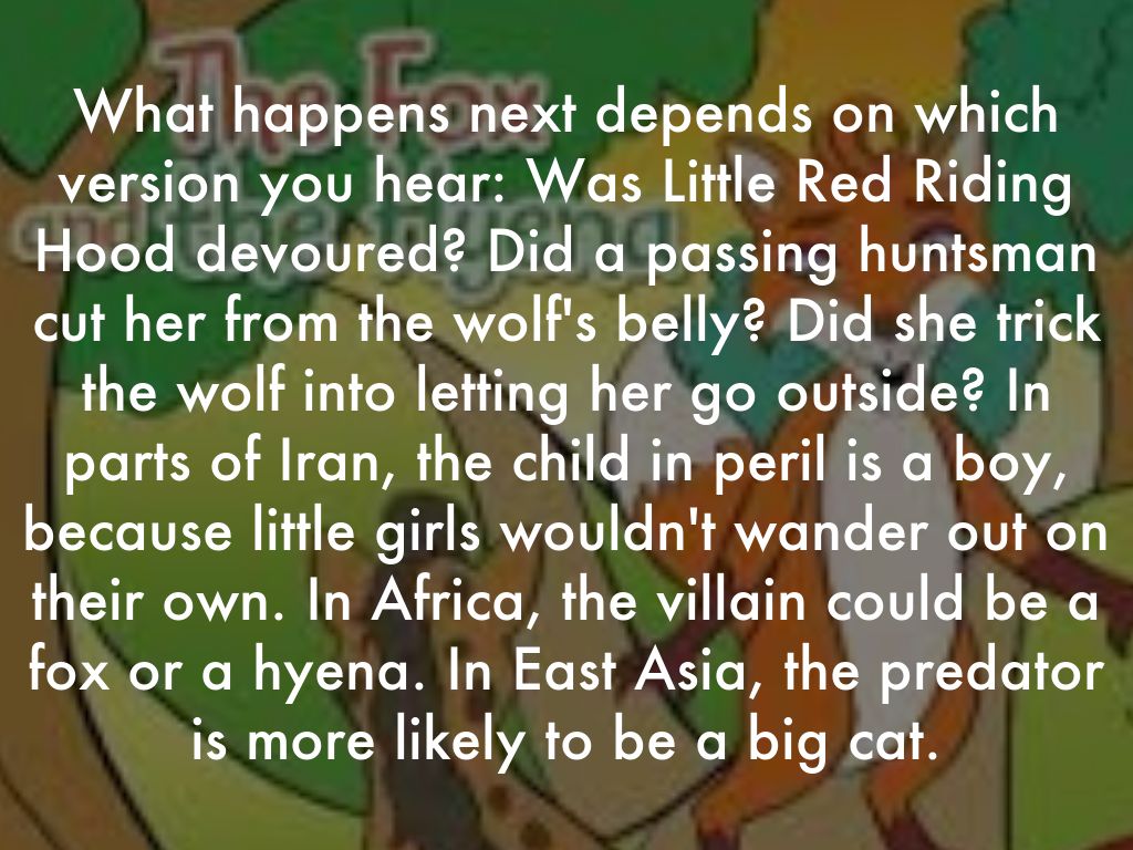 What happens next depends on which version you hear: Was Little Red Riding Hood devoured? Did a passing huntsman cut her from the wolf's belly? Did she trick the wolf into letting her go outside? In parts of Iran, the child in peril is a boy, because little girls wouldn't wander out on their own. In Africa, the villain could be a fox or a hyena. In East Asia, the predator is more likely to be a big cat.