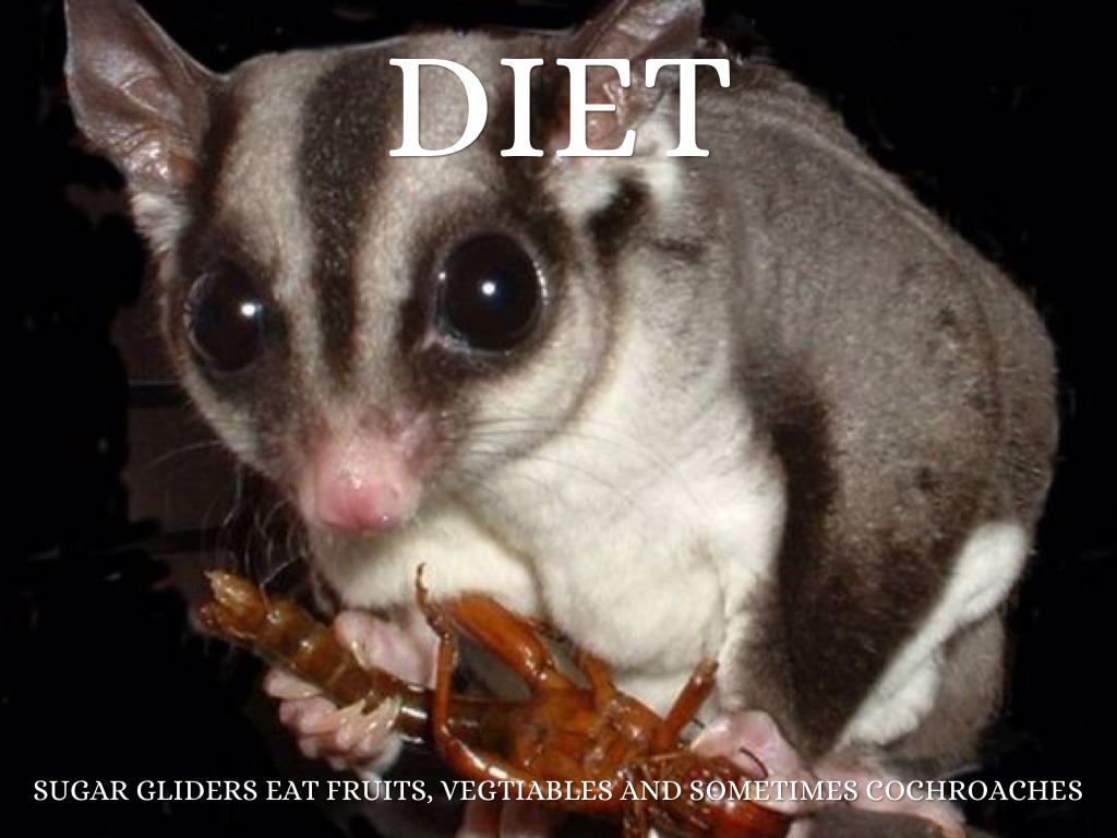 SUGAR GLIDERS EAT FRUITS, VEGTIABLES AND SOMETIMES COCHROACHES