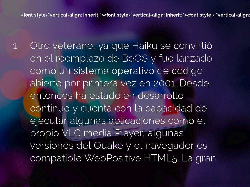 Otro veterano, ya que Haiku se convirtió en el reemplazo de BeOS y fué lanzado como un sistema operativo de código abierto por primera vez en 2001. Desde entonces ha estado en desarrollo continuo y cuenta con la capacidad de ejecutar algunas aplicaciones como el propio VLC media Player, algunas versiones del Quake y el navegador es compatible WebPositive HTML5. La gran mayoría de aplicaciones de BeOS también son compatibles con Haiku.