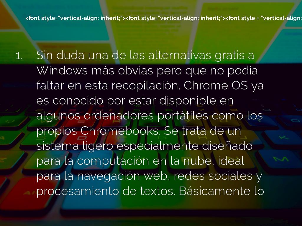 Sin duda una de las alternativas gratis a Windows más obvias pero que no podía faltar en esta recopilación. Chrome OS ya es conocido por estar disponible en algunos ordenadores portátiles como los propios Chromebooks. Se trata de un sistema ligero especialmente diseñado para la computación en la nube, ideal para la navegación web, redes sociales y procesamiento de textos. Básicamente lo único que hacen muchos usuarios de PC. Puedes saber algo más sobre Chrome OS y descargarlo para su prueba desde este mismo enlace.