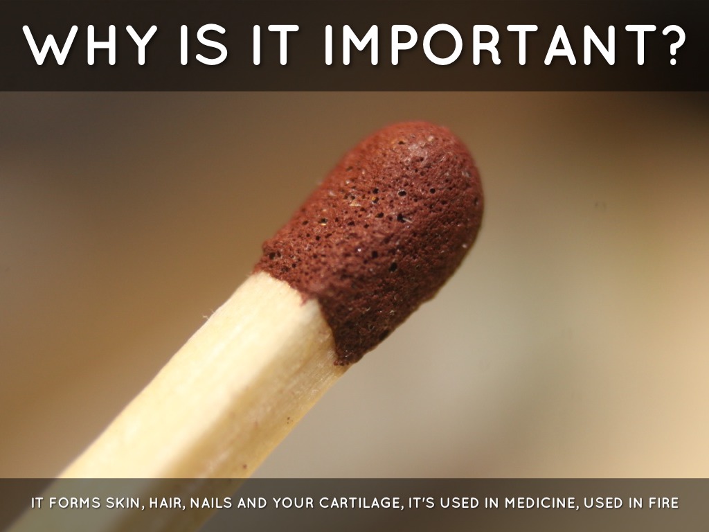 IT FORMS SKIN, HAIR, NAILS AND YOUR CARTILAGE, IT'S USED IN MEDICINE, USED IN FIRE