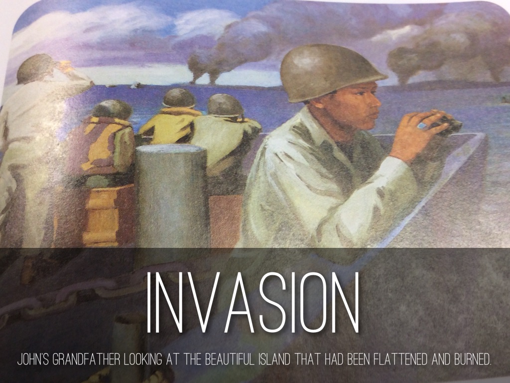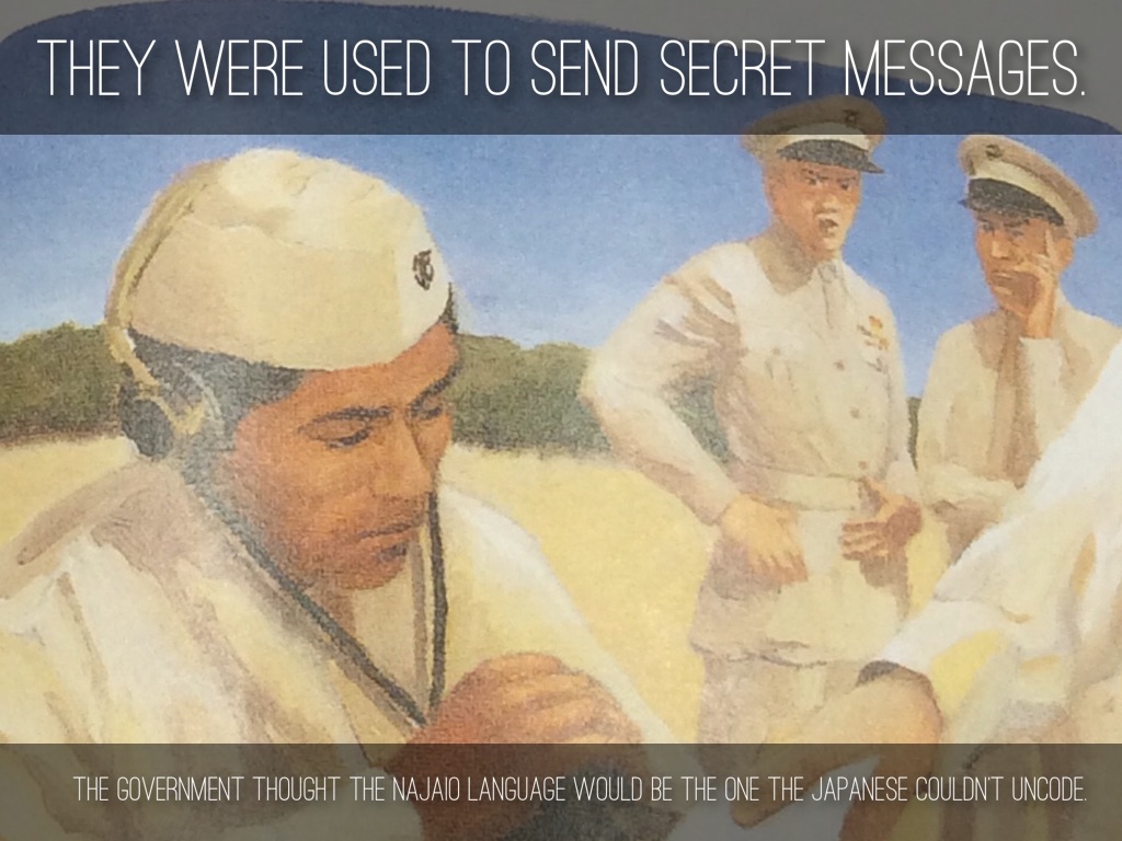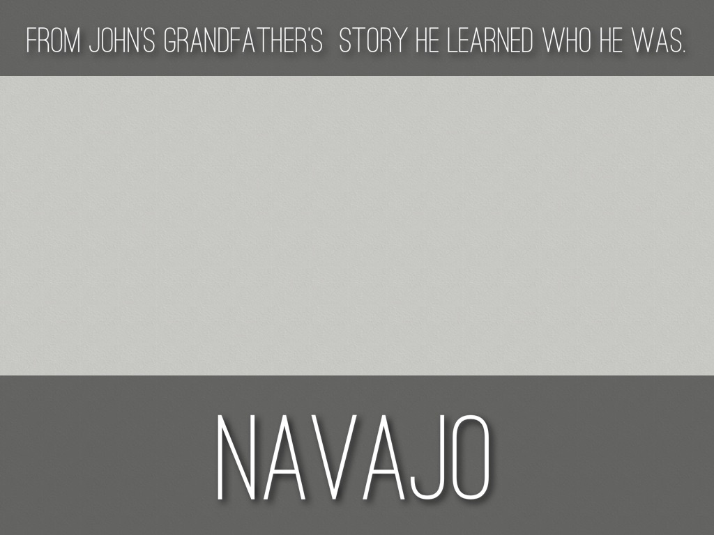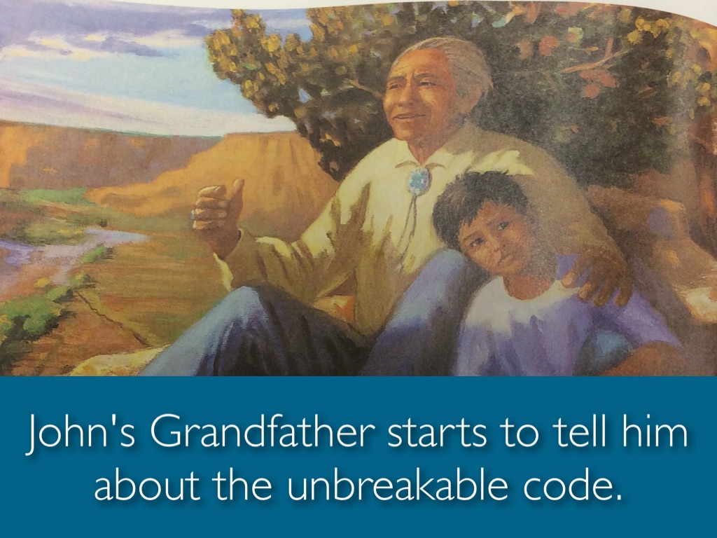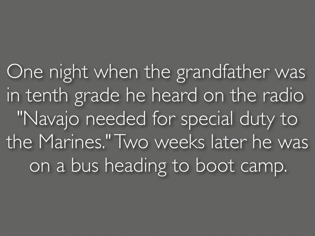 One night when the grandfather was in tenth grade he heard on the radio "Navajo needed for special duty to the Marines." Two weeks later he was on a bus heading to boot camp.