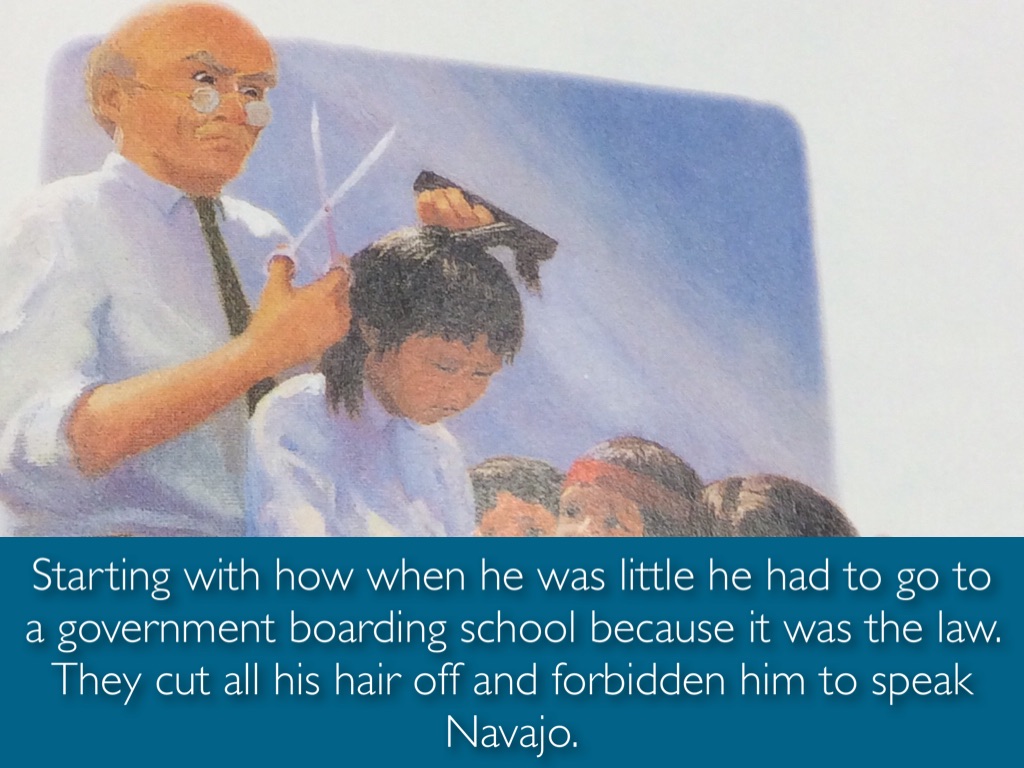 Starting with how when he was little he had to go to a government boarding school because it was the law. They cut all his hair off and forbidden him to speak Navajo.