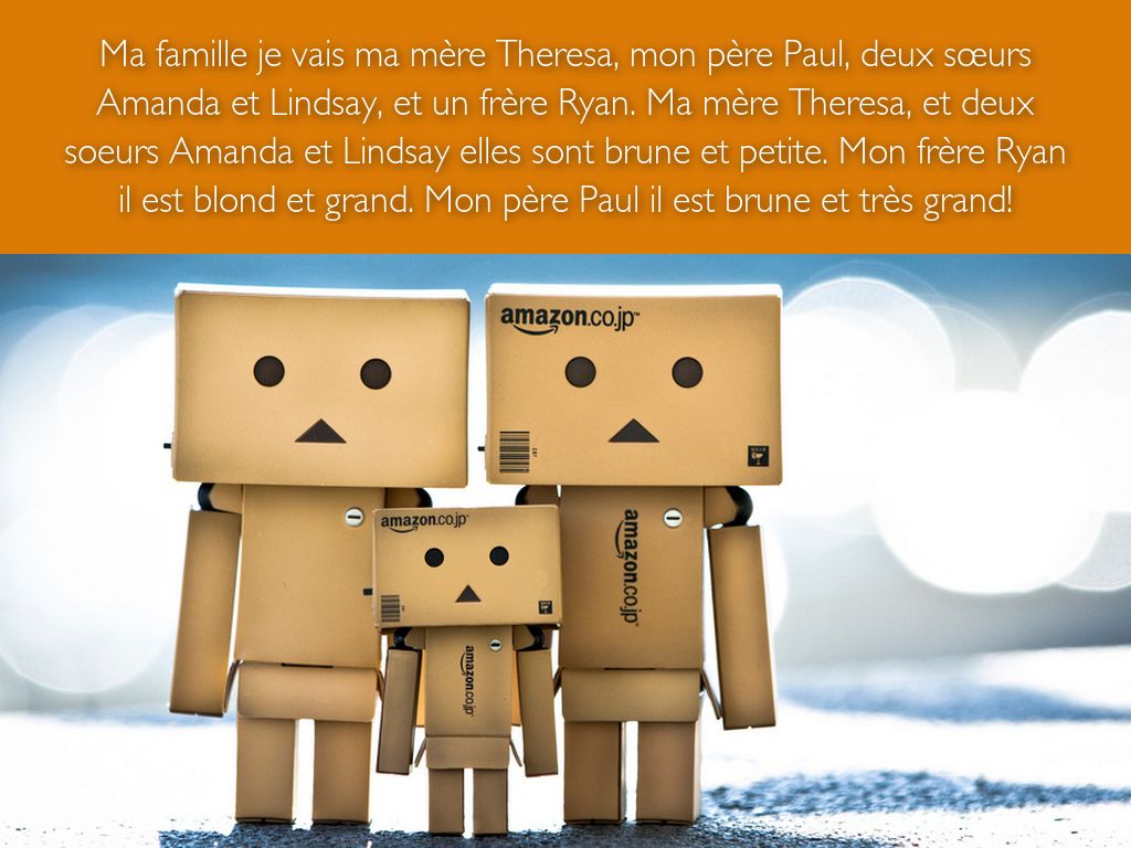 Ma famille je vais ma mère Theresa, mon père Paul, deux sœurs Amanda et Lindsay, et un frère Ryan. Ma mère Theresa, et deux soeurs Amanda et Lindsay elles sont brune et petite. Mon frère Ryan il est blond et grand. Mon père Paul il est brune et très grand!