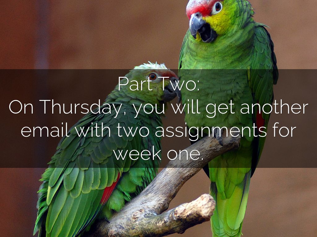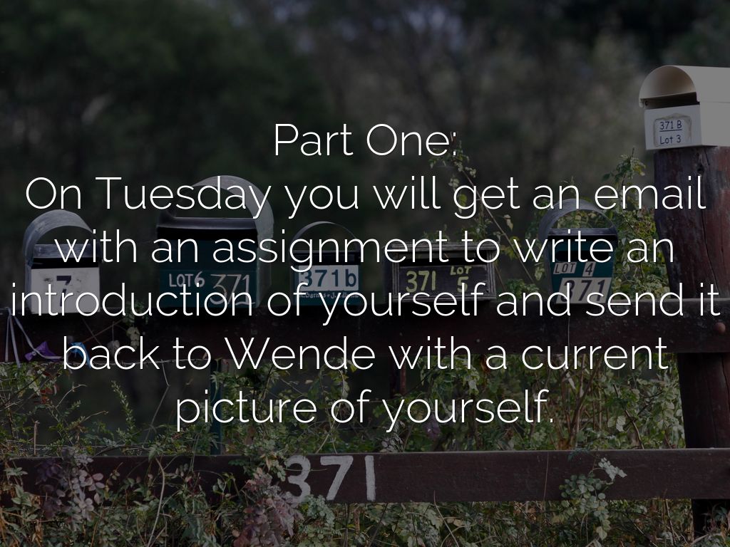 Part One: On Tuesday you will get an email with an assignment to write an introduction of yourself and send it back to Wende with a current picture of yourself.