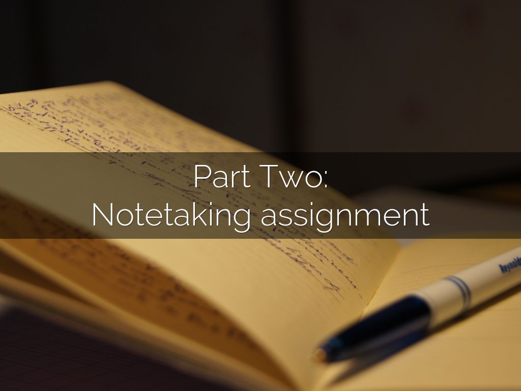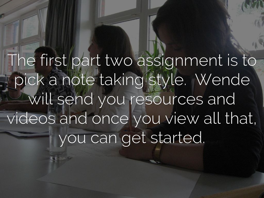 The first part two assignment is to pick a note taking style. Wende will send you resources and videos and once you view all that, you can get started.