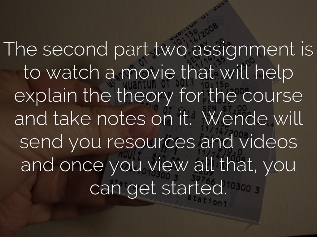 The second part two assignment is to watch a movie that will help explain the theory for the course and take notes on it. Wende will send you resources and videos and once you view all that, you can get started.