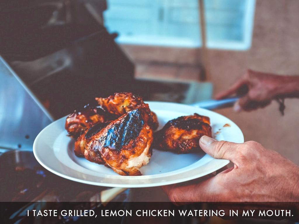 I TASTE GRILLED, LEMON CHICKEN WATERING IN MY MOUTH.