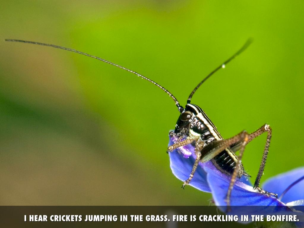 I HEAR CRICKETS JUMPING IN THE GRASS. FIRE IS CRACKLING IN THE BONFIRE.